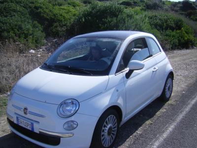 ...sondern mit der ungeliebten Ryan-Air. Diesmal hat's eine angenehme Abflugzeit, 15h15, Ankunft 17h. Wir haben einen wundervollen Flug, den Rhein entlang, wir sehen den Bodensee, die Alpen, den Po, Korsika. Nach Ankunft ewige Wartezeit auf's Auto, es wird ein Fiat 500 Automatik, fast neu, cremefarben, schicke „Knutschkugel“.